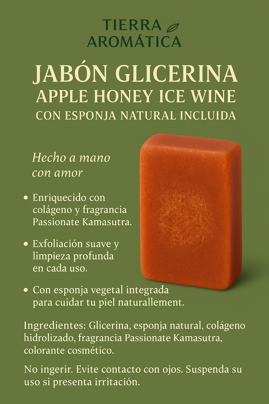 Glicerina, esponja natural, colágeno hidrolizado, fragancia Passionate Kamasutra, colorante cosmético.